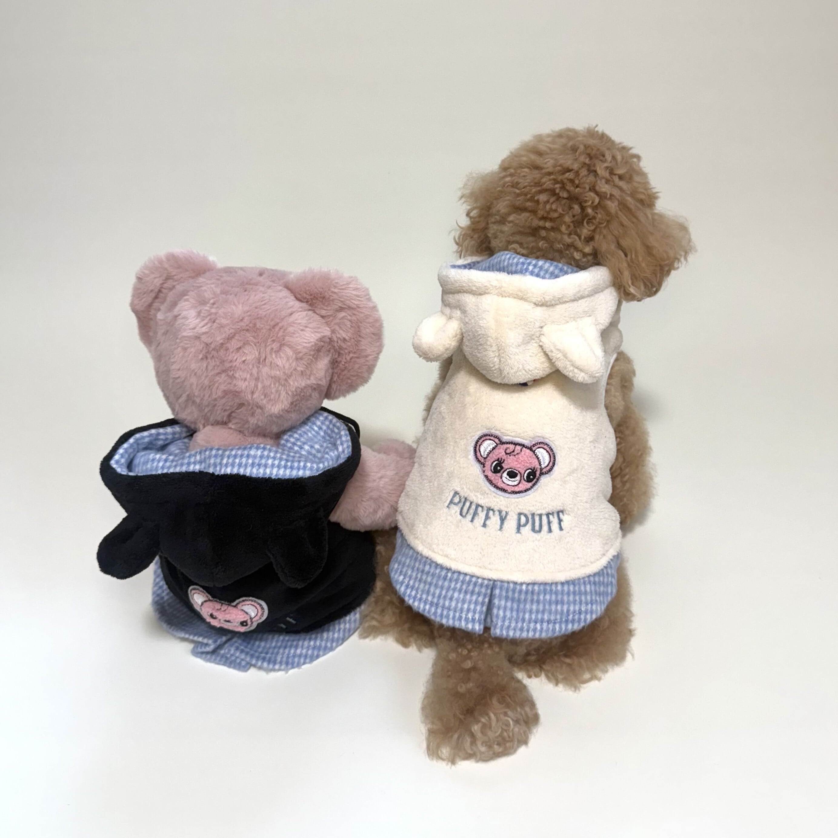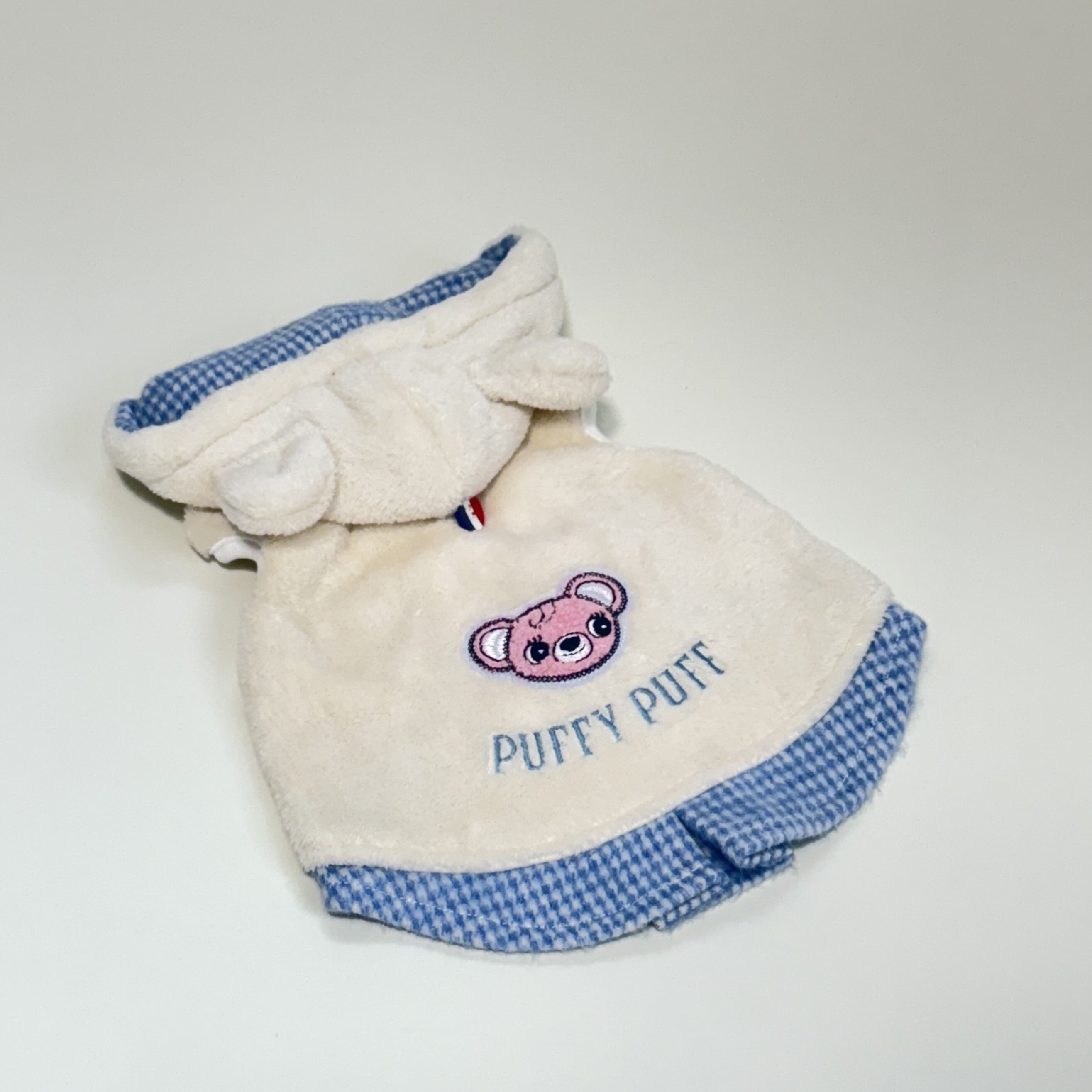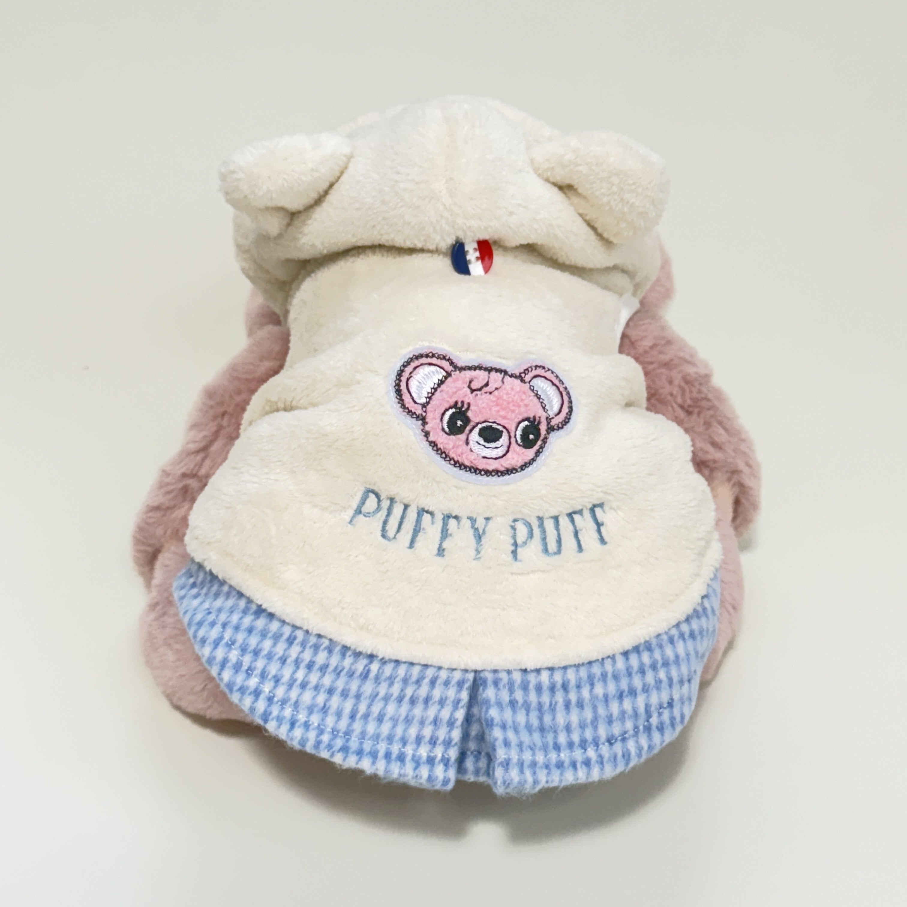 背中と胸元にはPUFFY PUFFのオリジナルキャラクター「パフちゃん」のワッペン、ブランドロゴを刺繍。裾にはブルーの千鳥格子柄をプラスし、上品さと可愛らしさを兼ね備えた一着に仕上げました。