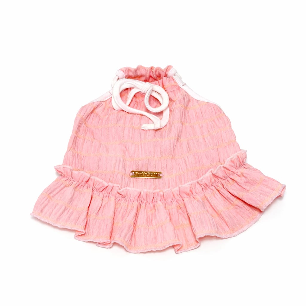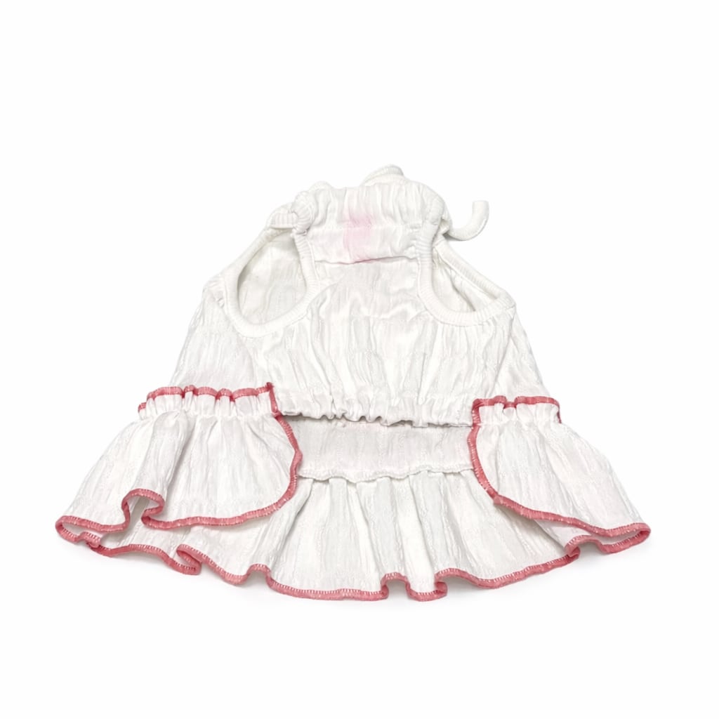首元はリボン仕様になっており、着丈も調整できて、着脱もしやすくデザインのアクセントにも。